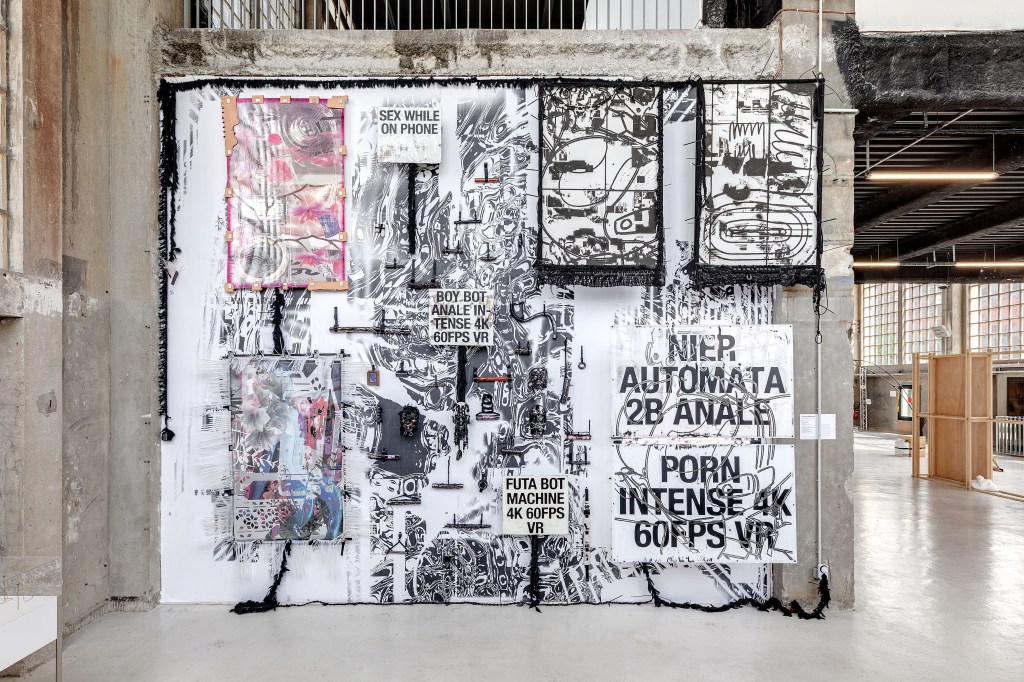 Cerné de ces accumulations de matières, il m’explique sa manière de travailler. C’est avant tout un long travail d’assimilation qui mène à la formation de ces objets hybrides. Le jeune artiste s’est rendu attentif à ce qui se passait sur internet, a épluché les sites pornographiques et les forums, à la fois de gamers mais aussi d’échange de services sexuels, et s’est même engagé à certains moments dans des conversations anonymes. Un véritable intérêt s’est développé chez lui pour ce qu’il pourrait appeler les « mutations du désir érotique », le « néoporno ». Son travail se situe précisément à la croisée de tous ces flux, pour la plupart numériques, qu’il ingurgite et dont il fait naître des modélisations et des assemblages chimériques.